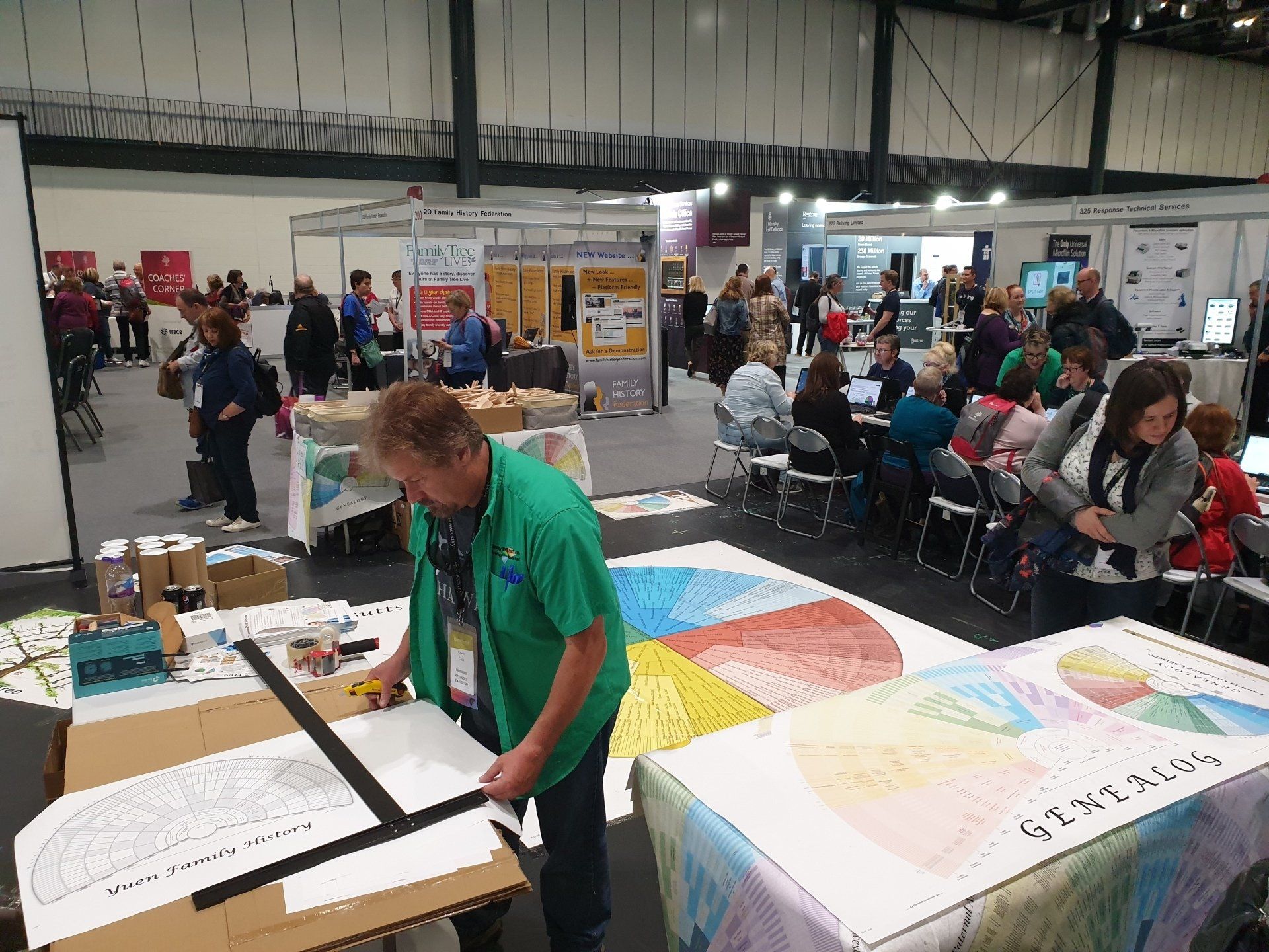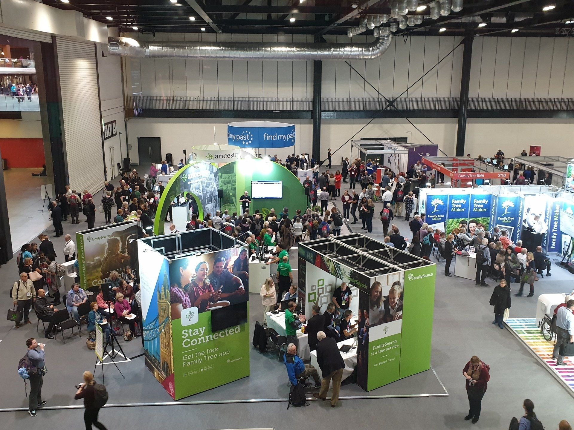 Ausstellung begann bereits bei Ausstellungseröffnung am ersten Tag um 09:45 Uhr. An den folgenden Tagen wurde der Andrang noch größer. Es folgten sogar lange Warteschlange! So etwas habe ich auf einem Deutschen Genealogentag leider noch nie erlebt! Vertreten waren unter anderem die kommerziellen Anbieter Ancestry, MyHeritage, FindMyPast, sowie diverse DNA Testanbieter, aber auch Genealogie Software "Familytreemaker". Nicht zu vergessen, der Hauptsponsor FamilySearch. Es wurden Scanner demonstriert, mit denen Dokumente und Bücher digitalisiert werden. Sogar das britische Verteidigungsministerium sowie weitere Vereine und Organisationen waren vertreten.