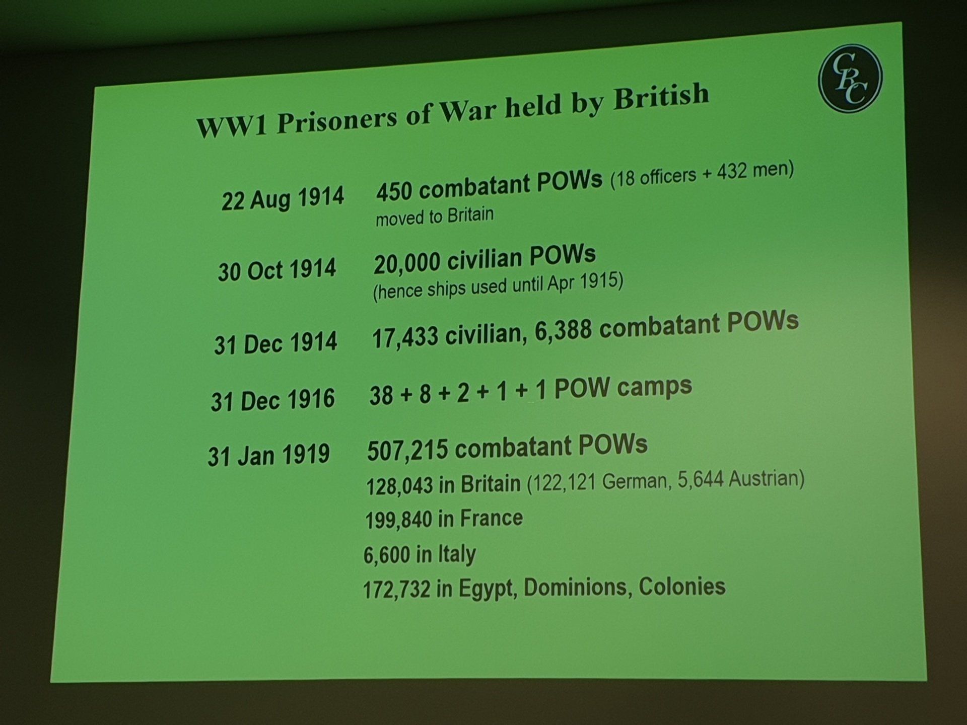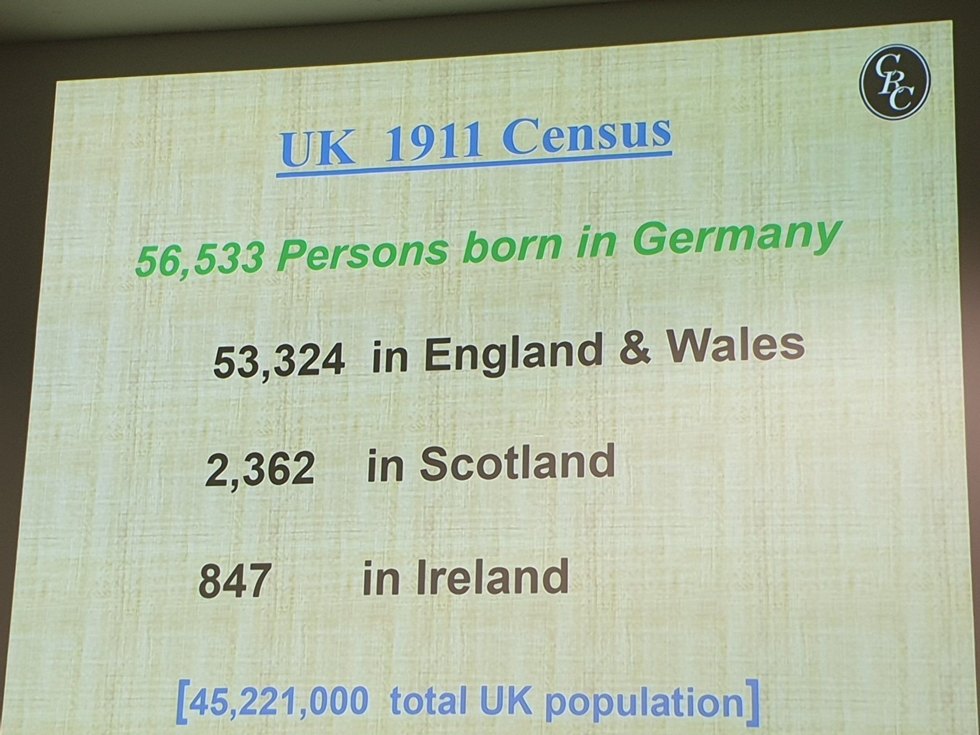 Seine Präsentation bot eine sehr anschauliche Erklärung für die Internierung und Inhaftierung deutscher Zivilisten und Militärkämpfer vor 100 Jahren in Großbritannien und Irland. Es gab diverse Hinweise zum Zugriff auf nützliche Online- und andere Quellen in britischen, deutschen, amerikanischen und schweizerischen National-, Bundes-, Lokal- und Facharchiven, um Einzelheiten über das Leben der Internierten, der Gefangenen und ihrer Wachen, vielleicht Ihrer Verwandten, einschließlich einiger Fluchten und Todesfälle, zu erfahren. Beispiele für humanitäre Unterstützung von Quäkern, CVJM, Heilsarmee und anderen Wohlfahrtsorganisationen wurden beschrieben.